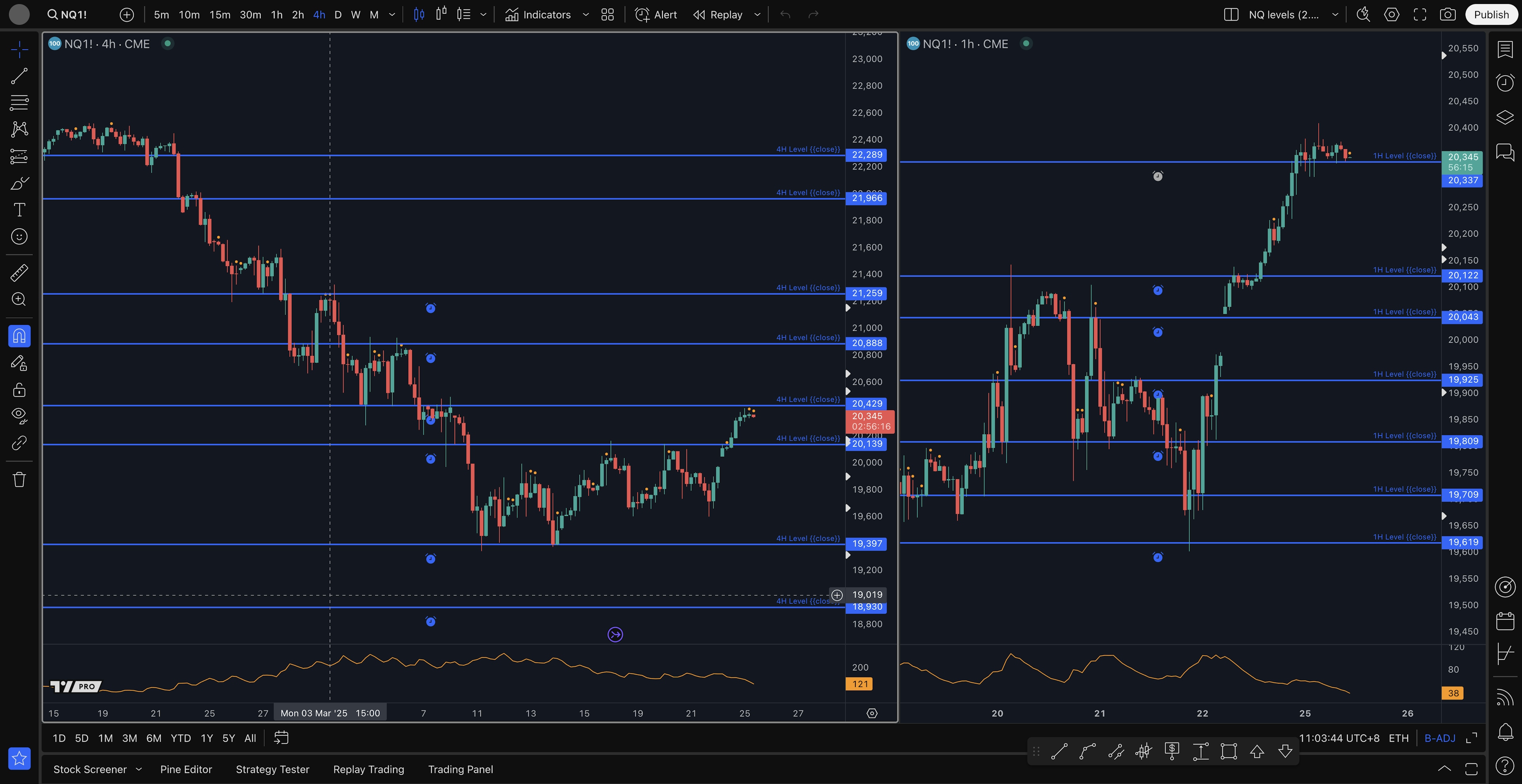 - 4H close, or 2H pin bar, or double 1H pin, or 1H inside bar / Hikk above or below level