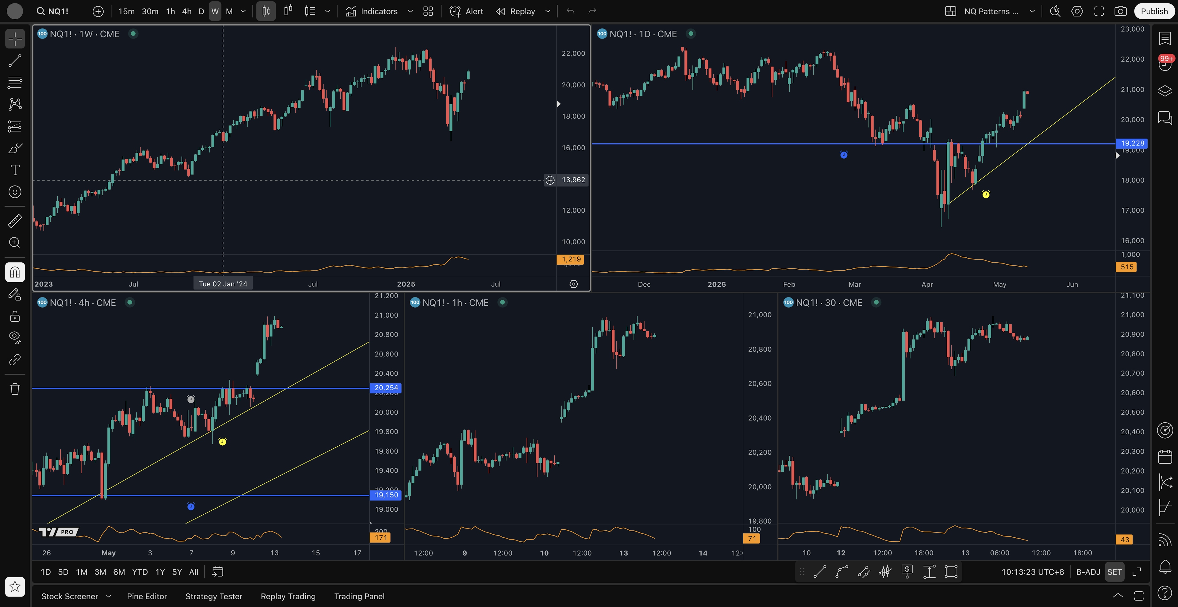 - 4H pattern long setup: daily ascending triangle broken out and retested